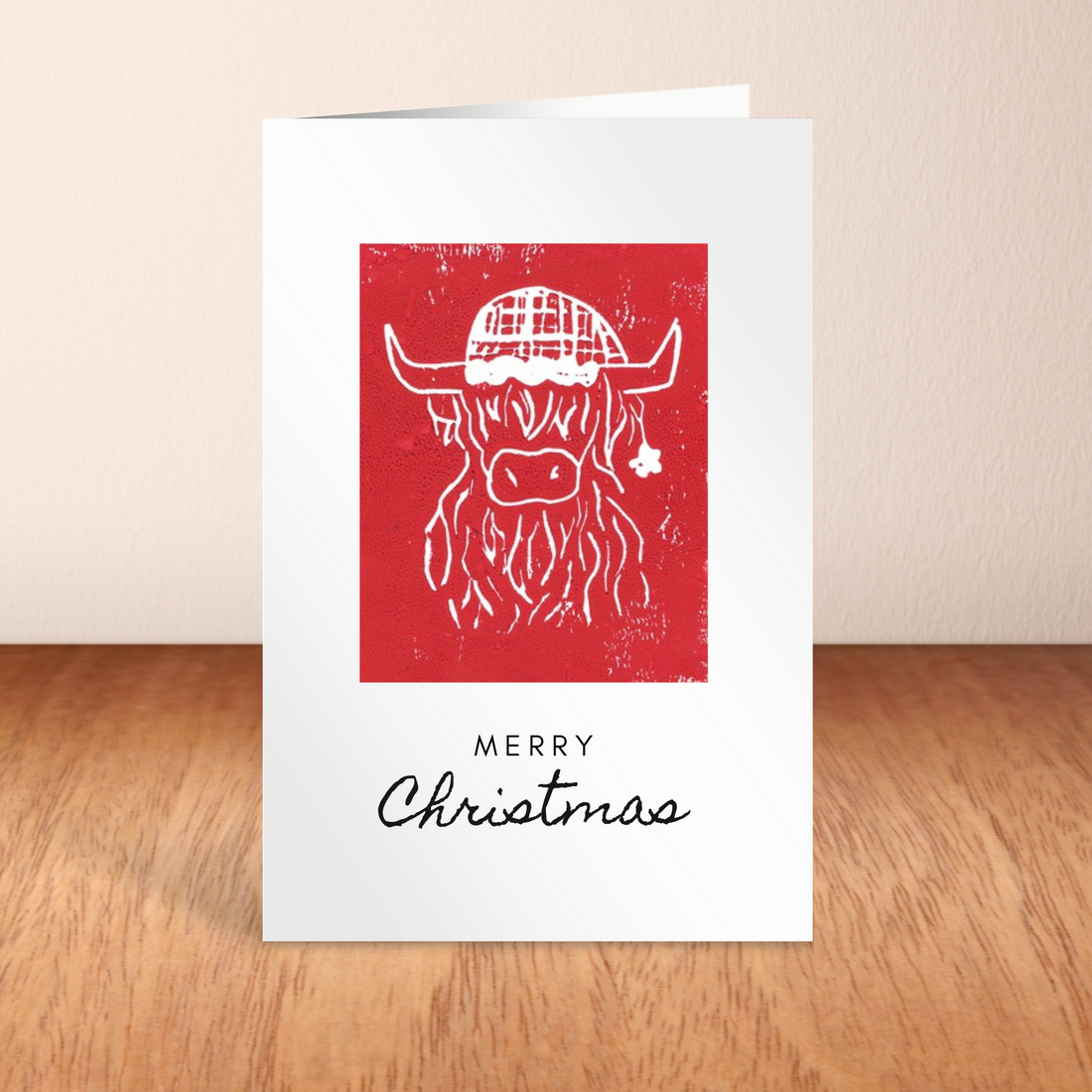 Highland Coo, Scottish Christmas Card Lino print design by Clara McCabe Choose from packs of...